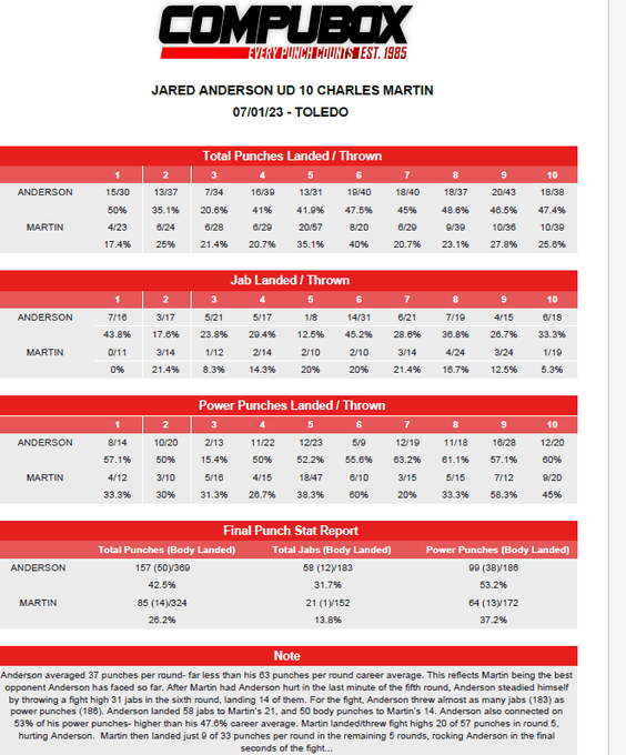 Anderson normally averaged sixty-three punches per round with a 40 percent connect rate but tonight the average punches thrown was thirty-seven punches per round and he landed sixteen punches for an average of nearly 43 percent connect rate. Martin landed 85 of 324 punches for a mere 27 percent.
